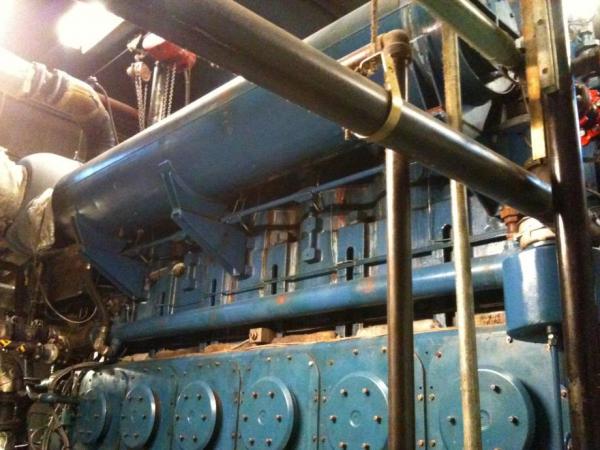 Being in the co-gen room feels akin to being inside a dog kennel with an elephant and it’s easy to imagine that you’re below deck in an engine room. The picture above is of the co-gen unit—or at least the portion that fit in the frame. You can see the reciprocating engine, with the exhaust to the left. The motor (electricity generator) is to the right outside the frame.