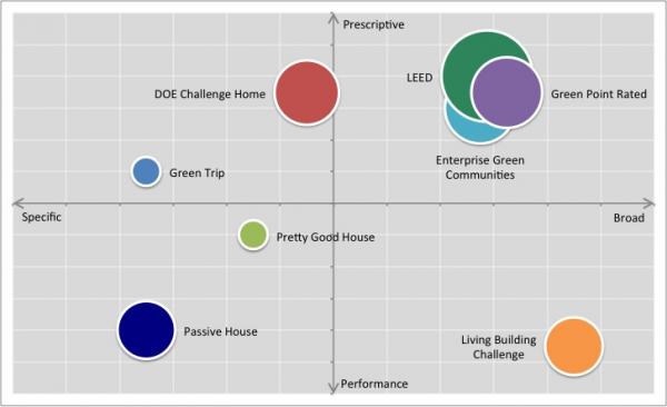 Each rating system has been ranked according to Broad vs. Specific and Prescriptive vs. Performance. This shouldn't be interpreted as Good vs. Bad- different programs fit different projects. That being said, I definitely have my favorites.