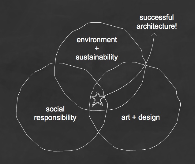 At the closing panel session, a slide prepared by Henry Beer was displayed to kick things off, three equally sized overlapping circles including the concepts of 'art & design,' 'social responsibility' and 'environment & sustainability,' the idea being that successful architecture is the intersection of these as I've sketched here.